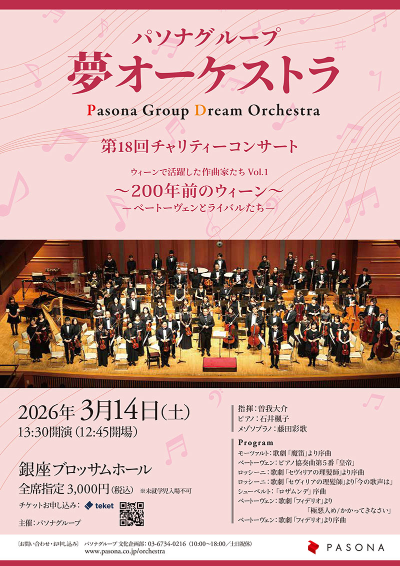 パソナグループ「夢オーケストラ」第18回チャリティコンサートウィーンで活躍した作曲家たちVol.1 ~200年前のウィーン~ ―ベートーヴェンとそのライバルたち― お申込み順に「良席」でのご案内となります! 詳しく見る 舞台るつぼ 数量限定で良席確保! カフェテリアポイント全額利用可能! 演出 上村聡史×主演 坂本昌行 相反する思惑が“るつぼ”のように溶け合い、 だれも予想できない結末へと導く。 詳しく見る 坂東玉三郎(人間国宝・歌舞伎俳優) ~お話と素踊り~ 10%OFF!! 日本芸術界の至宝。洗練された言葉と磨き上げられた芸、その身体一つで美を表現!立女形の神髄や歌舞伎の魅力に迫る特別企画 詳しく見る 中村勘九郎 中村七之助 春暁歌舞伎特別公演2026 ご優待!500円OFF! 中村勘九郎、中村七之助を中心に、中村屋一門が毎年行う全国巡業公演 詳しく見る リーディングドラマ「老害の人」 10%OFF!! 高齢者小説の名手・内館牧子の話題作『老害の人』が、愉快痛快な舞台に! 詳しく見る パソナグループ50周年 特別ご優待~PASONA 50th ANNIVERSARY~千住明プロデュースオペラ「万葉集」(演奏会形式) 公演終了 千年の時を超えて紡がれる万葉の詩― 愛し、祈り、生きた人々の“いのち”の声が、あなたに語りかける 詳しく見る 兵庫県立芸術文化センター開館20周年記念公演舞台明日を落としても 公演終了 何度でも、立ち上がる―― 阪神・淡路大震災から30年。兵庫県立芸術文化センター開館20周年におくる、演劇界の巨匠・栗山民也が手掛ける神戸「あの時」を巡る物語。 詳しく見る リアル恐竜ショー恐竜パーク 公演終了 オーストラリア発! 見て、学んで、楽しめる恐竜ショー! 詳しく見る パソナグループ「夢オーケストラ」ヨハン・シュトラウスⅡ世 生誕200年記念コンサート 公演終了 <~日墺文化協会Presents~> 2025年は、音楽の都ウィーンを代表する、ウィンナワルツの王、ヨハン・シュトラウスⅡ世の生誕200年の年です!シュトラウスの華やかで心躍る音楽の魅力をお楽しみください! お申込み順に「良席」でのご案内となります! 詳しく見る パソナグループ「夢オーケストラ」第17回チャリティコンサート 公演終了 <~未来への伝説~> 95歳の現役クラリネット奏者の北村英治氏をお迎えしジャズに初挑戦! 後半は、壮大な物語の音楽をお楽しみください! お申込み順に「良席」でのご案内となります! 詳しく見る The Reunion: Together Again 公演終了 この冬、ラミンが帰ってくる! ラミンと親交のある俳優たちとの “再会”を祝したコンサート 『The Reunion』のアンコール公演 詳しく見る 新作ミュージカル「ディズニーくまのプーさん」【追加公演】 公演終了 2024年春、日本初上陸した新作ミュージカル『ディズニー くまのプーさん』。ご好評につき、早くも11月、東京・新国立劇場 中劇場にて追加公演が決定!! 等⾝⼤のパペットを役者たちが操り、豪華なセット、新旧の愛すべき⾳楽の⼒によって、100エーカー森にこれまでにない⽣命を吹き込みます! まだ観たことのない方も、もう一度観たいという方も⼩さなお子さまのみならず、誰しもにある⼦ども⼼に感動を運ぶ、くまのプーさんと仲間たちとの楽しく、愉快な舞台をぜひ劇場でお楽しみください! 魅惑のスーパー・パーフェクトキャラクターが織りなし、舞い上げる、夢のステージ。感動と衝撃と至福のひとときを“今”貴女に…!!! 詳しく見る ENTERTAINMENT DANCE PERFORMANCEBOLERO ~最終章~ 公演終了 「BOLERO」美しき煌めきの締章 ~BOLERO が躍る BOLERO が揺れる BOLERO が魅せる~ 東山義久×三浦宏規 DANCE&ACT 詳しく見る パソナグループ「夢オーケストラ」第15回チャリティコンサート『第九』~令和6年能登半島地震 復興支援~ 公演終了 ベートーヴェンの第九の初演から200周年!夢オーケストラが「パソナグループ第九合唱団」と共に、歓喜の歌で愛と元気をお届けします! S席完売につきA席のみのご案内になります! 詳しく見る 藤巻亮太“3月9日”『THANK YOU LIVE 2024』日比谷野外音楽堂 公演終了 自身の代表曲レミオロメン“3月9日”のCDリリースから20周年。 ソロ活動でも、毎年「感謝を伝える日」として大事にしてきたという3月9日(土)に日比谷公会堂にて<THANK YOU LIVE 2024>を開催♪ 詳しく見る 十八世中村勘三郎十三回忌追善 中村勘九郎 中村七之助中村勘太郎 中村長三郎 陽春歌舞伎特別公演 2024 公演終了 中村勘九郎、中村七之助を中心に、 中村屋一門の巡業公演 全国6ヶ所で開催! 詳しく見る 舞台ロスメルスホルム 公演終了 「近代演劇の父」イプセン × 「日本演劇界の巨匠」栗山民也 これぞイプセンの知られざる傑作! 理性、情欲、打算、 ひとたび均衡が破れた時、現れてくるものとは--- 詳しく見る 宝塚歌劇 宙組公演ミュージカル・ノワール『PAGAD(パガド)』~世紀の奇術師カリオストロ~ショー・スピリット『Sky Fantasy!』 公演中止 大人の魅力あるれる 芹香斗亜 満を持して宙組トップスター就任! 新たなる宙組の幕開けをお見逃しなく♪ 詳しく見る ミュージカルスクールオブロック 公演終了 遂に日本初演! 1,452名